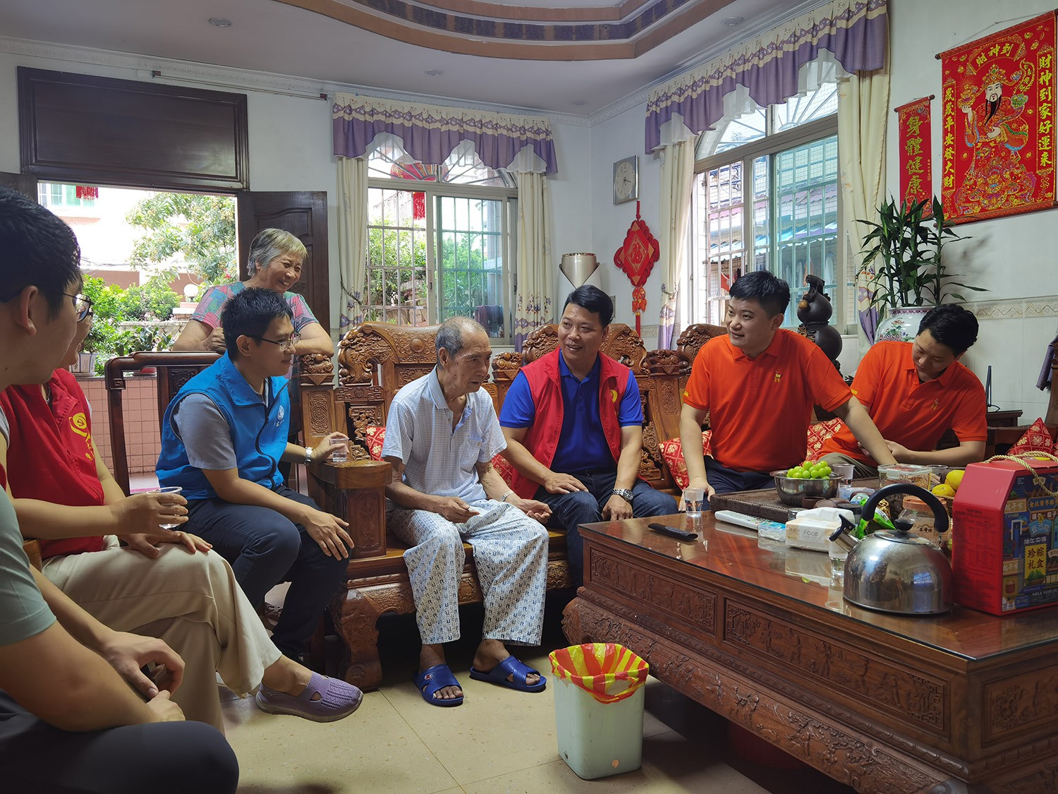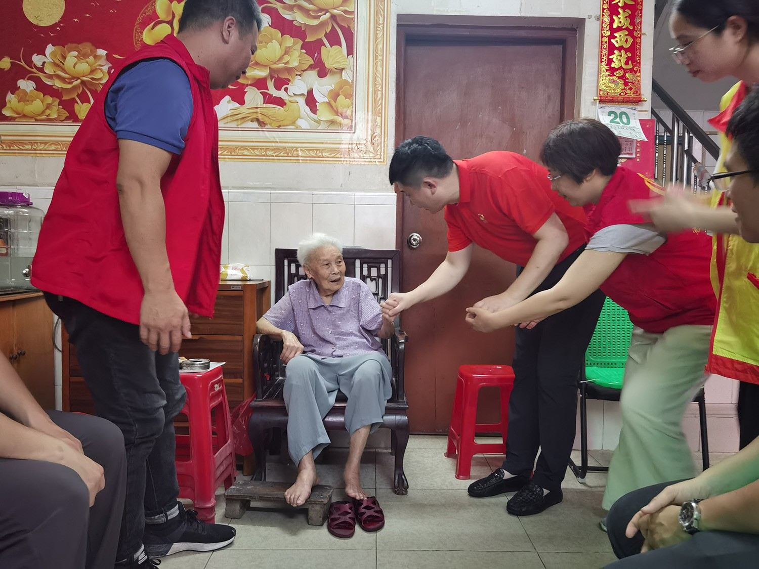 6月20日下午,活动统筹人周雁玲、党员苏泽彬、黄旭、周超与沙涌村党支部成员、大龙街社工站成员,一同深入大龙街沙涌村入户探访老党员,向他们致以端午节日的问候并送上生活用品一批。