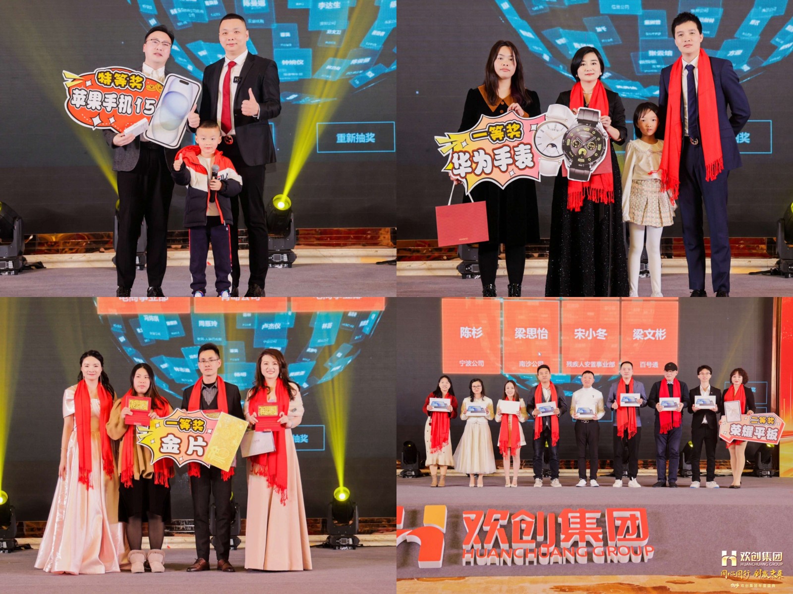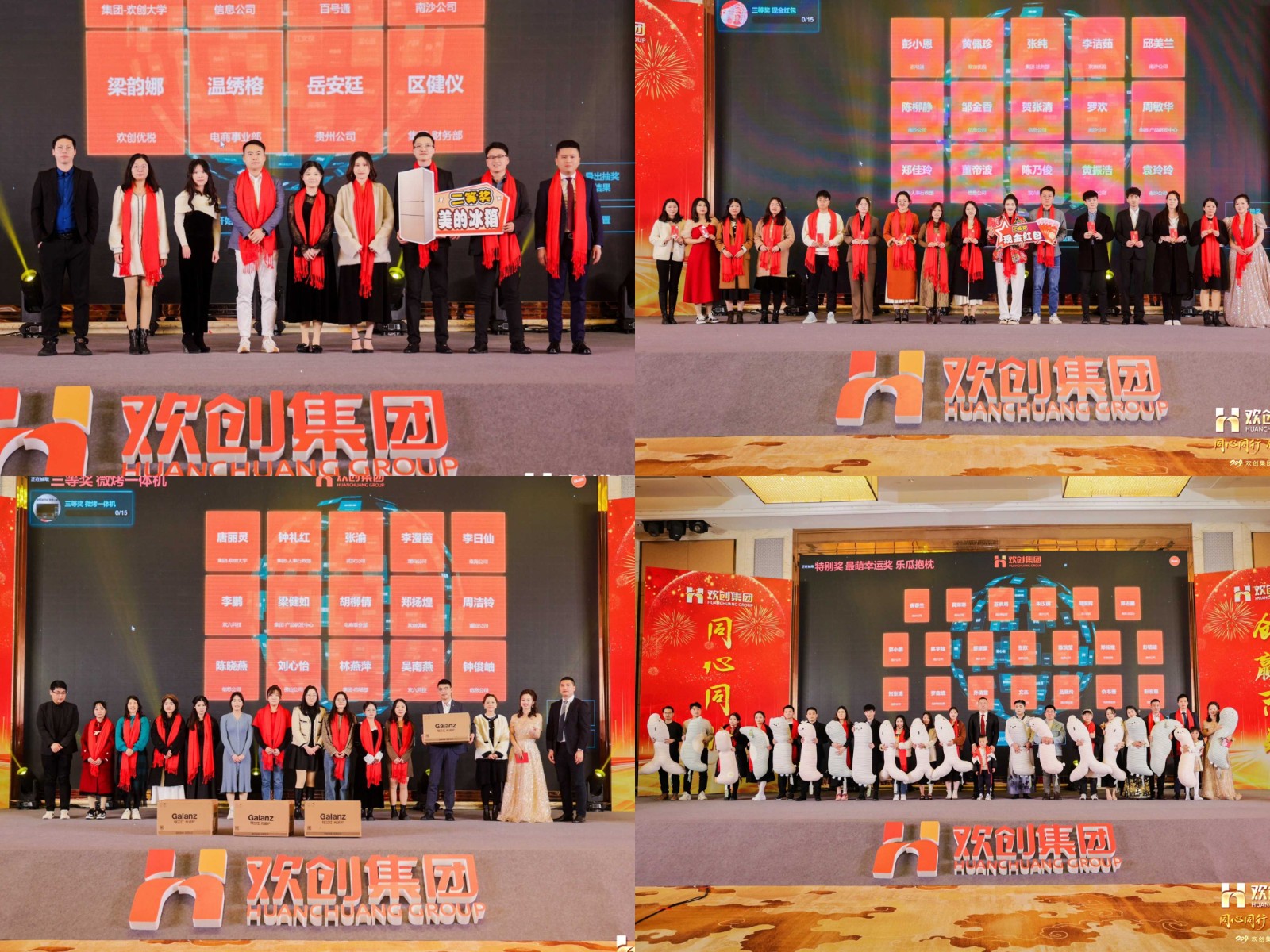 本次盛典共设置了7轮幸运大抽奖:其中,特等奖苹果15手机,一等奖金条和手表,二等奖荣耀平板电脑和美的冰箱,三等奖现金红包500元和格兰士烤微一体机,幸运奖五谷杂粮礼盒和零食礼盒,特别奖乐瓜抱枕。奖品丰富,人人有份。