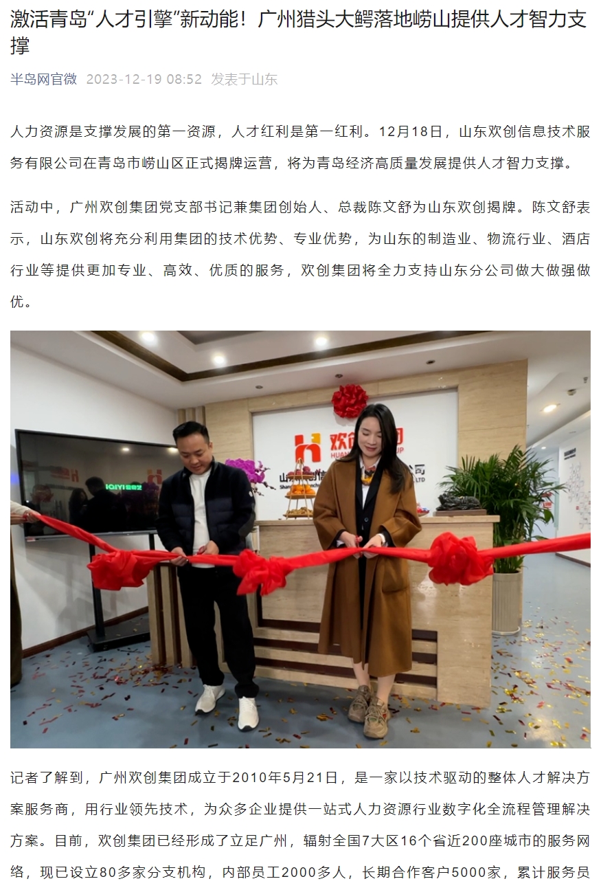 半岛网:激活青岛“人才引擎”新动能!山东华体会官网(中国)信息技术服务有限公司正式揭牌运营