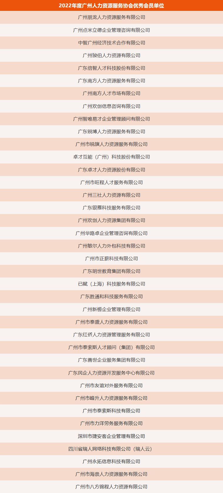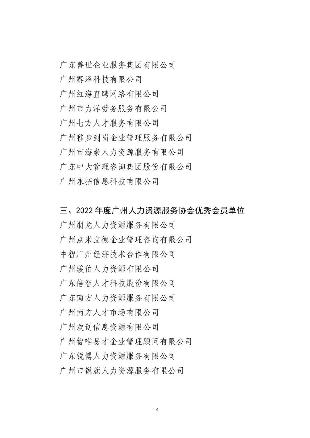 根据《关于开展2022年度人力资源服务评选活动的通知》(穗人协〔2022〕17号)要求,经自愿申报、资格审查、专家评审、社会公示等程序,确定了20家2022年度人力资源服务品牌机构、25家人力资源优质服务商、38家优秀会员单位及16名人力资源服务先锋人物,现予以公布,具体名单见附件。