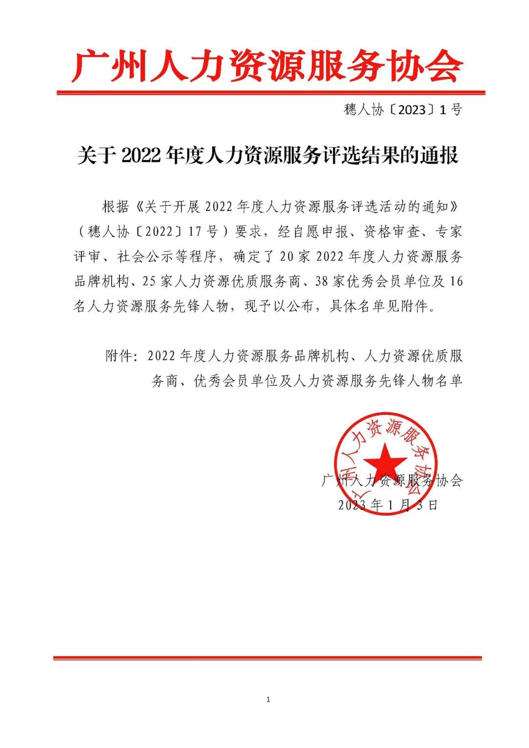 祝贺华体会官网(中国)集团荣获2022年度人力资源服务品牌机构、2022年度人力资源优质服务商、2022年度广州人力资源服务协会优秀会员单位,华体会官网(中国)集团陈文舒荣获2022年度人力资源服务先锋人物。